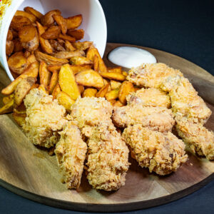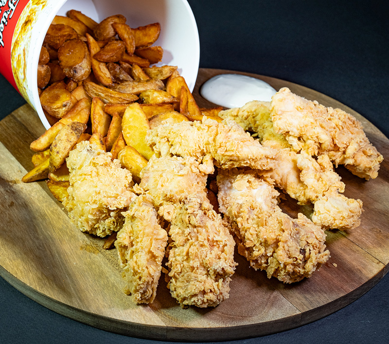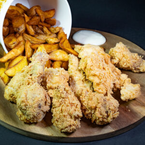 4 crispy, 4 aripioare, 2 ciocanele, cartofi prajiti, 2 buc sos usturoi