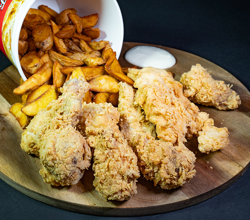 4 crispy, 4 aripioare, 2 ciocanele, cartofi prajiti, 2 buc sos usturoi